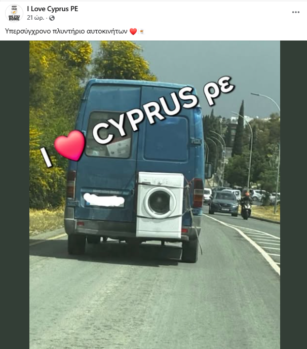Συγκεκριμένα, στη σελίδα του facebook, «I love cyprus ρε», πολίτης ανάρτησε φωτογραφία στην οποία βλέπουμε το όχημα να μεταφέρει πλυντήριο δεμένο με σχοινιά. Ο λόγος άγνωστος.