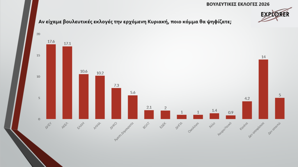 Η μάχη για την πρώτη θέση παραμένει εξαιρετικά αμφίρροπη, με τον ΔΗΣΥ στο 17,6% και το ΑΚΕΛ στο 17,1%. Η διαφορά είναι οριακή και δεν δημιουργεί σαφές προβάδισμα, με τα δύο μεγάλα κόμματα να κινούνται σχεδόν παράλληλα στην πρόθεση ψήφου.