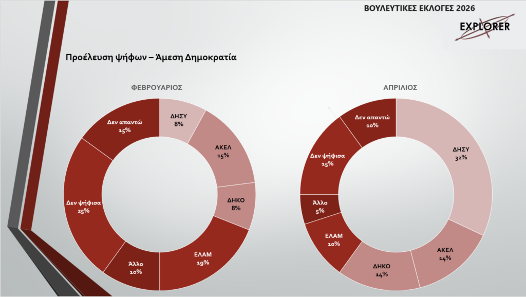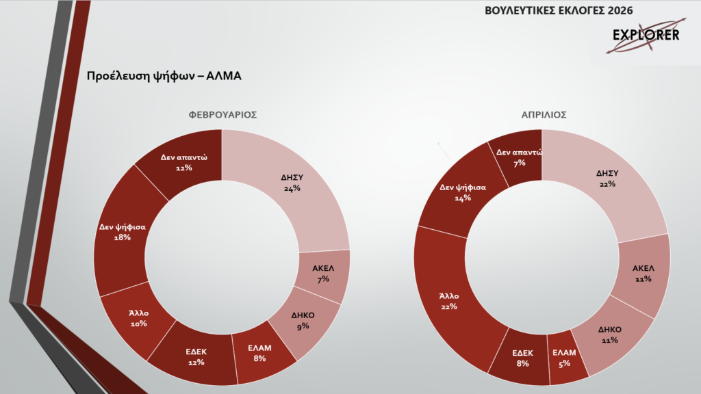 Ο ΔΗΣΥ διατηρεί την πρώτη θέση με 17,6%, οριακά μπροστά από το ΑΚΕΛ που καταγράφει 17,1%, με τη μεταξύ τους διαφορά να παραμένει σε επίπεδα στατιστικού λάθους. Την ίδια στιγμή, το ΕΛΑΜ υποχωρεί στο 10,6%, ενώ το ΑΛΜΑ ενισχύεται σημαντικά φτάνοντας το 10,2%, δημιουργώντας μια ιδιαίτερα έντονη μάχη για την τρίτη και τέταρτη θέση. Το ΔΗΚΟ καταγράφει μικρή άνοδο στο 7,3%, την ώρα που η Άμεση Δημοκρατία υποχωρεί στο 5,6%, επιβεβαιώνοντας τη μεταβλητότητα στο συγκεκριμένο πολιτικό χώρο.