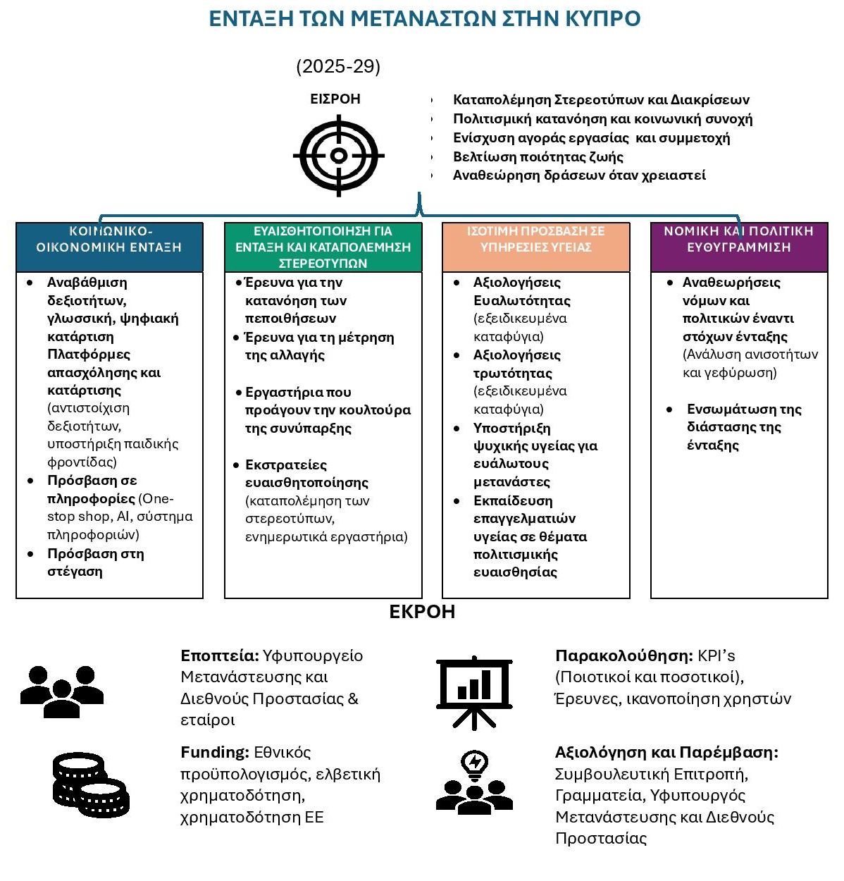 Σε αυτό το εκρηκτικό σκηνικό, η Λευκωσία απαντά με την «Εθνική Στρατηγική για την Ένταξη Μεταναστών 2026-2029». Πρόκειται για ένα ολιστικό σχέδιο του Υφυπουργείου Μετανάστευσης που ξεπερνά την απλή έννοια της φιλοξενίας. Η στρατηγική εδράζεται σε οκτώ βασικούς πυλώνες δράσης, καλύπτοντας όλο το φάσμα της ανθρώπινης δραστηριότητας: από την πρώτη υποδοχή και την αξιοπρεπή στέγαση, μέχρι την πρόσβαση στην υγεία και την εκπαίδευση.