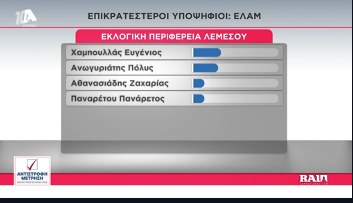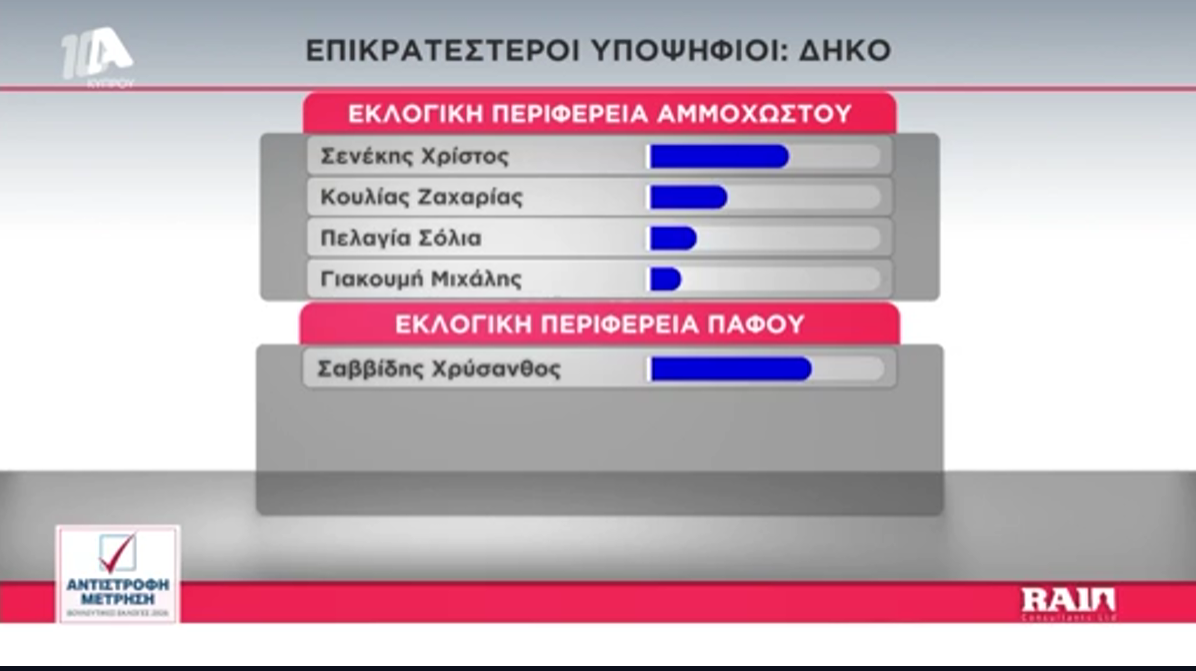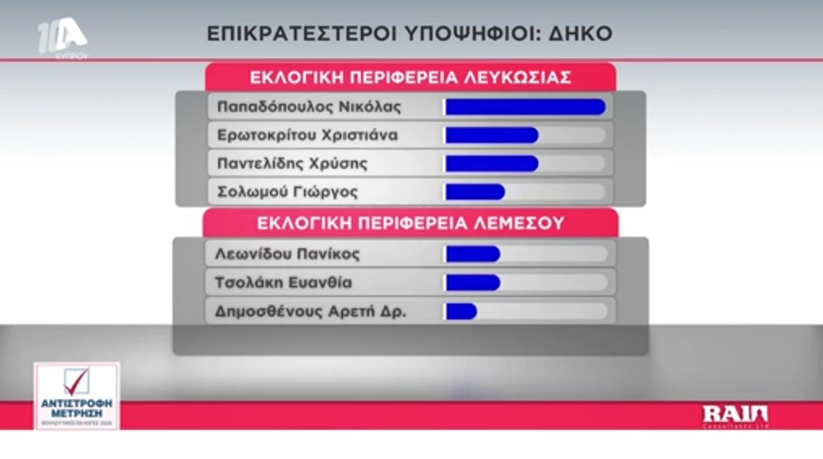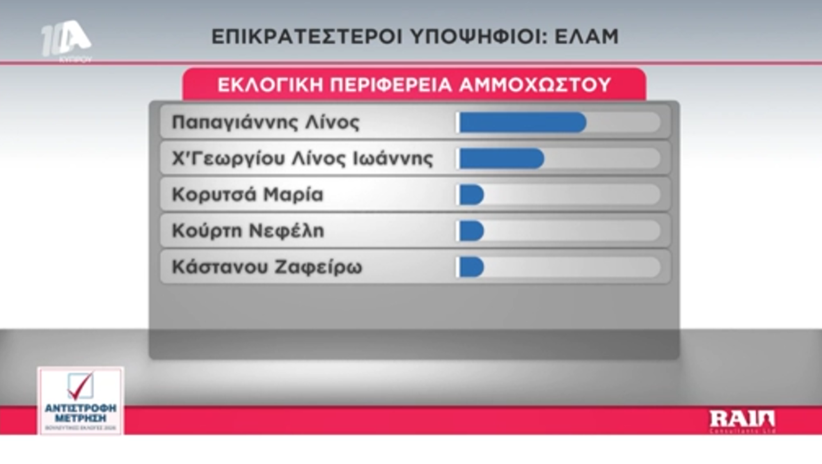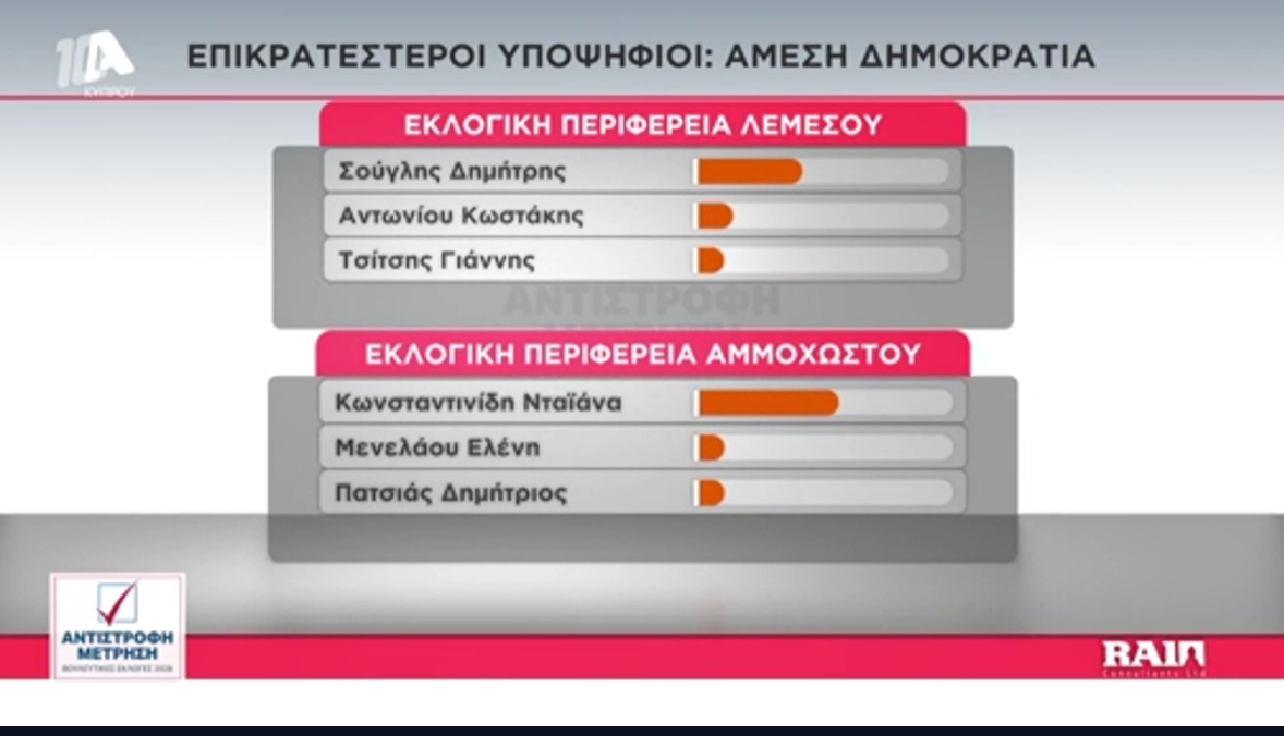 Στη Λάρνακα, η Αννίτα Δημητρίου εμφανίζεται με σαφές προβάδισμα, επιβεβαιώνοντας την ισχυρή της επιρροή, ενώ στην Πάφο η μάχη δείχνει πιο αμφίρροπη μεταξύ нескольких υποψηφίων με κοντινά ποσοστά. Στην Αμμόχωστο και τη Λεμεσό καταγράφεται πολυδιάσπαση, με αρκετά στελέχη να κινούνται σε παρόμοια επίπεδα, κάτι που προμηνύει έντονο ανταγωνισμό μέχρι τέλους για τις διαθέσιμες έδρες. Στη Λευκωσία, τέλος, δεν προκύπτει ξεκάθαρη κυριαρχία ενός προσώπου, αλλά μια ομάδα υποψηφίων με συγκρίσιμη δυναμική, στοιχείο που αναδεικνύει τη μάχη «σώμα με σώμα» στο εσωτερικό του κόμματος.