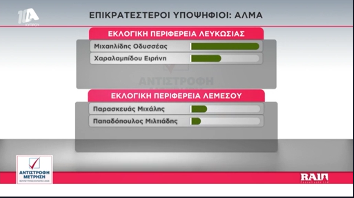 Στην περίπτωση του ΑΛΜΑ, η εικόνα είναι πιο συγκεντρωτική, με τον Οδυσσέα Μιχαηλίδη να ξεχωρίζει καθαρά στη Λευκωσία και να λειτουργεί ως βασικός πόλος έλξης για το κόμμα, ενώ στις υπόλοιπες περιφέρειες οι υποψήφιοι κινούνται σε πιο χαμηλά επίπεδα, υποδηλώνοντας εξάρτηση της συνολικής δυναμικής από συγκεκριμένα πρόσωπα.