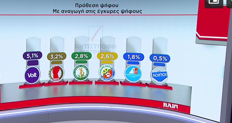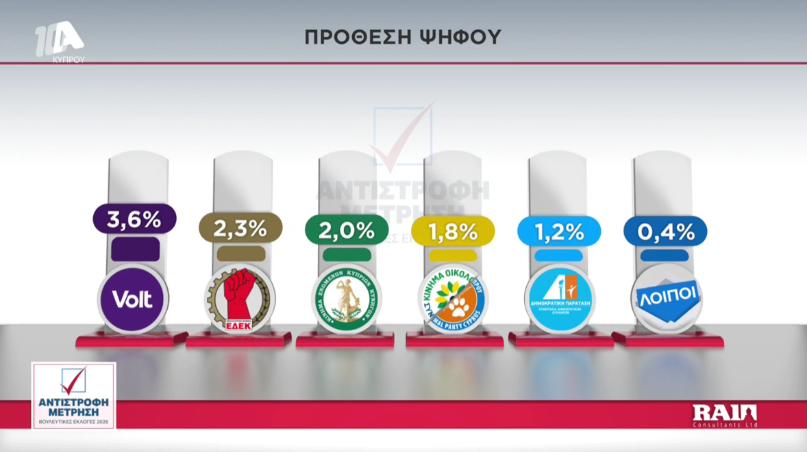 Στο επίπεδο των κομμάτων εκτός της πρώτης εξάδας, καταγράφεται περαιτέρω κατακερματισμός. Το Volt εμφανίζεται στο 3,6%, πλησιάζοντας οριακά επίπεδα κοινοβουλευτικής παρουσίας, ενώ η ΕΔΕΚ ακολουθεί με 2,3% και οι Οικολόγοι με 1,8%. Άλλα μικρότερα σχήματα κινούνται ακόμη χαμηλότερα, επιβεβαιώνοντας τη διασπορά της ψήφου σε πολλούς πολιτικούς σχηματισμούς.