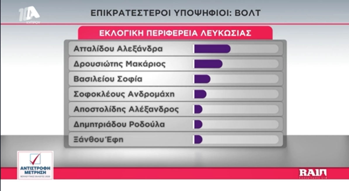 Στο Volt, η Αλεξάνδρα Ατταλίδου ξεχωρίζει στη Λευκωσία, καταγράφοντας σαφές προβάδισμα και αποτελώντας το βασικό πρόσωπο που μπορεί να οδηγήσει το κόμμα σε κοινοβουλευτική παρουσία, με τους υπόλοιπους υποψηφίους να ακολουθούν σε χαμηλότερα επίπεδα.
