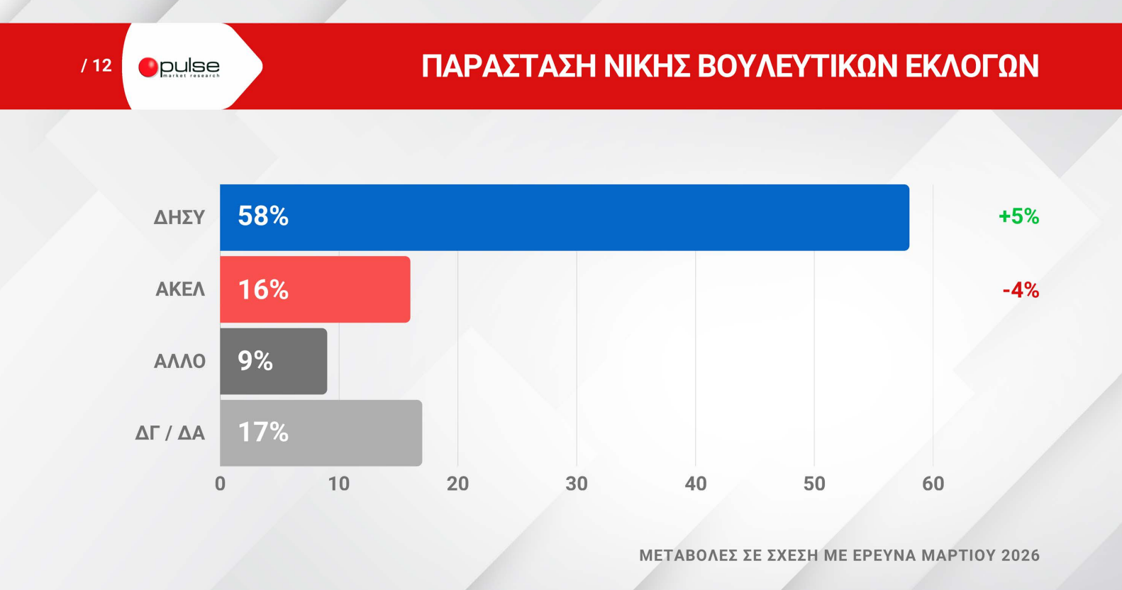 Στην παράσταση νίκης, ο ΔΗΣΥ καταγράφει ισχυρή κυριαρχία με 58%, αυξημένος κατά 5 ποσοστιαίες μονάδες σε σχέση με την προηγούμενη μέτρηση. Το ΑΚΕΛ ακολουθεί με 16% (-4%), ενώ 9% εκτιμά ότι θα επικρατήσει άλλο κόμμα. Σημαντικό παραμένει το ποσοστό των αναποφάσιστων/δεν απαντώ, που ανέρχεται στο 17%.