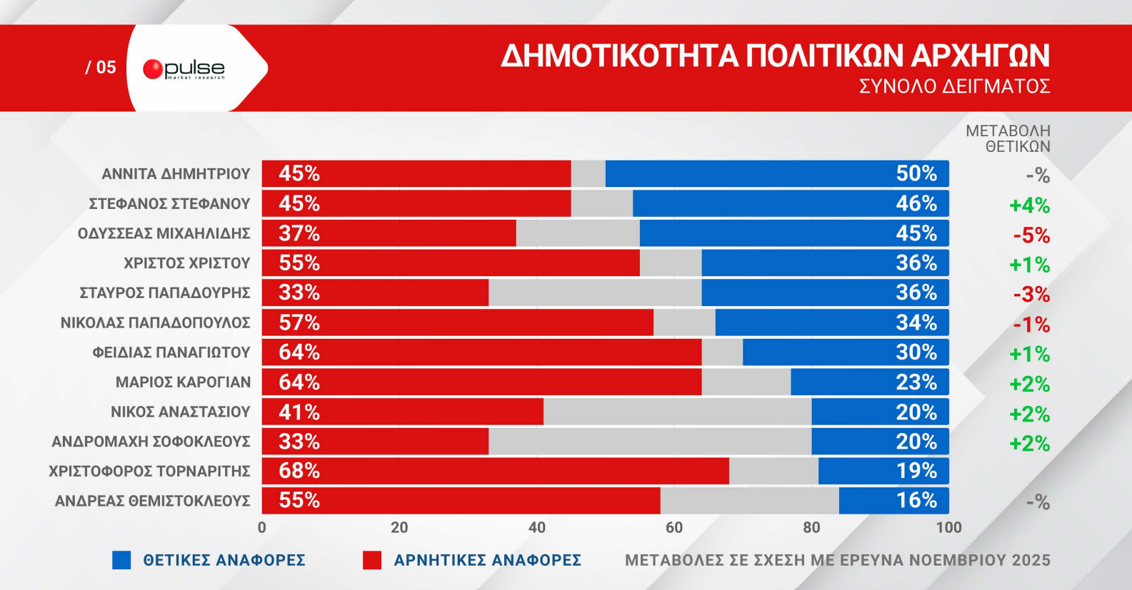 Στον αντίποδα, πιο «ισορροπημένη» εικόνα παρουσιάζει η Αννίτα Δημητρίου, με 50% θετικές και 45% αρνητικές γνώμες, ενώ ο Στέφανος Στεφάνου κινείται επίσης κοντά σε ισορροπία (46% θετικές – 45% αρνητικές), καταγράφοντας μάλιστα άνοδο +4% στις θετικές αξιολογήσεις.