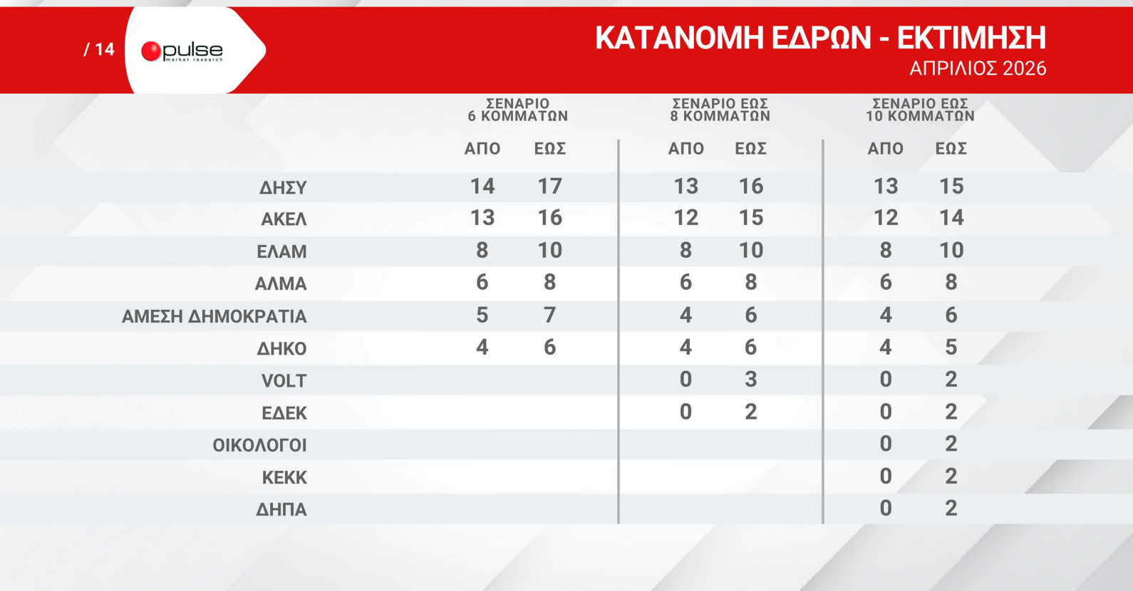 Σε ό,τι αφορά την κατανομή εδρών, το σενάριο εξακομματικής Βουλής δίνει στον ΔΗΣΥ από 14 έως 17 έδρες, στο ΑΚΕΛ από 13 έως 16 και στο ΕΛΑΜ από 8 έως 10. Το ΑΛΜΑ εκτιμάται ότι θα λάβει 6 έως 8 έδρες, η Άμεση Δημοκρατία Κύπρου από 5 εώς 7 έδρες ενώ ΔΗΚΟ από 4 εώς 6 έδρες. Τα υπόλοιπα κόμματα κινούνται σε χαμηλότερα επίπεδα, με οριακή ή περιορισμένη κοινοβουλευτική παρουσία, ανάλογα με το σενάριο.