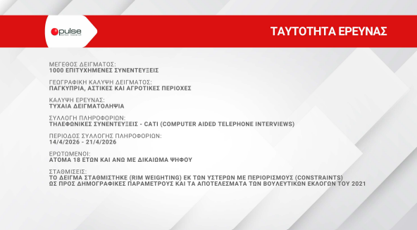 Η δημοσκόπηση πραγματοποιήθηκε σε δείγμα 1.000 ατόμων, με δικαίωμα ψήφου, καλύπτοντας παγκύπρια αστικές και αγροτικές περιοχές. Η συλλογή δεδομένων έγινε μέσω τηλεφωνικών συνεντεύξεων (CATI) κατά την περίοδο 14–21 Απριλίου 2026, με τυχαία δειγματοληψία. Το δείγμα σταθμίστηκε εκ των υστέρων (RIM weighting) βάσει δημογραφικών χαρακτηριστικών και των αποτελεσμάτων των βουλευτικών εκλογών του 2021.