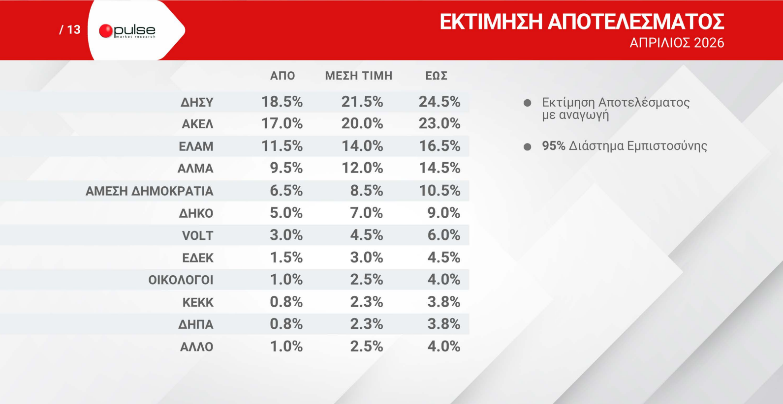 Σύμφωνα με την εκτίμηση αποτελέσματος, ο ΔΗΣΥ προηγείται με μέση τιμή 21,5%, με εύρος από 18,5% έως 24,5%, διατηρώντας σαφές προβάδισμα. Ακολουθεί το ΑΚΕΛ με 20,0% (17,0%–23,0%), ενώ τρίτο κατατάσσεται το ΕΛΑΜ με 14,0% (11,5%–16,5%). Πιο πίσω βρίσκονται το ΑΛΜΑ με 12,0%, η Άμεση Δημοκρατία Κύπρου με 8,5%, το ΔΗΚΟ με 7,0%, το VOLT με 4,5%, η ΕΔΕΚ με 3,0% και οι Οικολόγοι με 2,5%, ενώ τα υπόλοιπα κόμματα κινούνται σε χαμηλότερα ποσοστά.