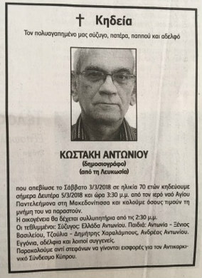 Παράκληση της οικογένειας είναι αντί στεφάνων να γίνουν εισφορές για τον Αντικαρκινικό Σύνδεσμο Κύπρου.