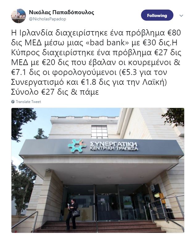 Συγκεκριμένα, σημείωσε ότι «η Ιρλανδία διαχειρίστηκε ένα πρόβλημα 80 δισεκατομμυρίων ευρώ ΜΕΔ μέσω μιας «κακής τράπεζας» με 30 δισεκατομμύρια. Η Κύπρος διαχειρίστηκε ένα πρόβλημα 27 δισεκατομμυρίων ευρώ ΜΕΔ με 20 δισεκατομμύρια που έβαλαν οι κουρεμένη και 7.1 δισεκατομμύρια οι φορολογούμενοι (5.3 για τον Συνεργατισμό και 1.8 δις για τη Λαϊκή)».