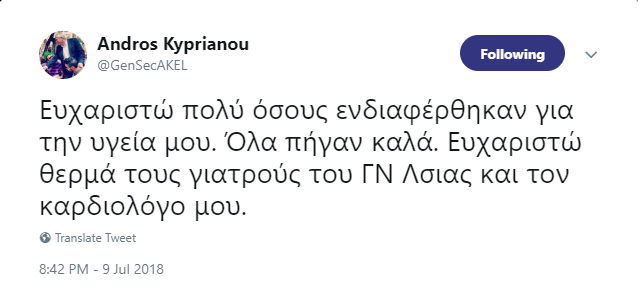 Με μια ανάρτησή του στο Twitter, ο Γενικός Γραμματέας του ΑΚΕΛ, Άντρος Κυπριανού, ευχαρίστησε όσους ενδιαφέρθηκαν για την κατάσταση της υγείας του.