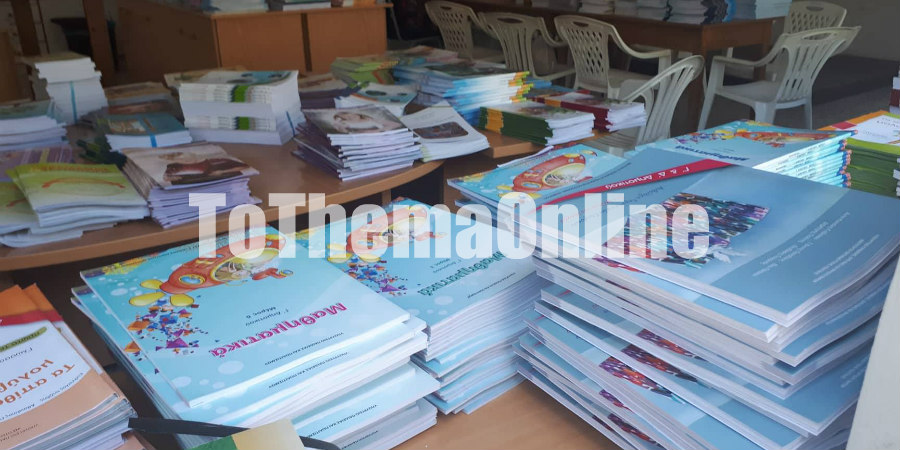 Ήδη σε δημοτικό σχολείο, όπως φαίνεται από τις φωτογραφίες, τα βιβλία μπαίνουν σε σειρά για να τα παραλάβουν οι μαθητές.