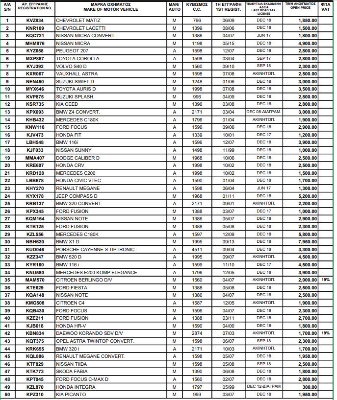 Η επιθεώρηση των οχημάτων μπορεί να γίνει την Τρίτη (2/10) από τις 10:00 - 14:30 με την δημοπρασία να διεξάγεται στις 15:00.
