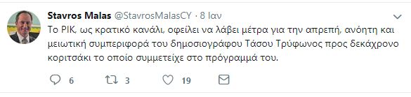 Όπως έγραψε ο Σταύρος Μαλάς: 'Το ΡΙΚ ως κρατικό κανάλι οφείλει να λάβει μέτρα για την απρεπή, ανόητη και μειωτική συμπεριφοράτου δημοσιογράφου Τάσου Τρύφωνος προς δεκάχρονο κοριτσάκι το οποίο συμμετείχε στο πρόγραμμά του'.