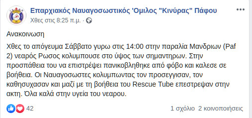Σε δημοσίευση του στο Facebook, ο Επαρχιακός Ναυαγοσωστικός Όμιλος “Κινύρας” Πάφου, την Κυριακή (9/6), αναφέρει ότι γύρω στις 14:00 του Σαββάτου (8/6) νεαρός Ρώσος ο οποίος ενώ κολυμπούσε στο ύψος των συμαντήρων, πανικοβλήθηκε.