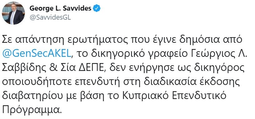 Mετά και τις κατηγορίες του Γενικού Γραμματέα του ΑΚΕΛ, ο Γενικός Εισαγγελέας Γιώργος Σαββίδης απάντησε πως το δικηγορικό του γραφείο δεν έχει ενεργήσει ως δικηγόρος οποιουδήποτε επενδυτή στην διαδικασία έκδοσης διαβατηρίου με βάση το Κυπριακό Επενδυτικό Πρόγραμμα.