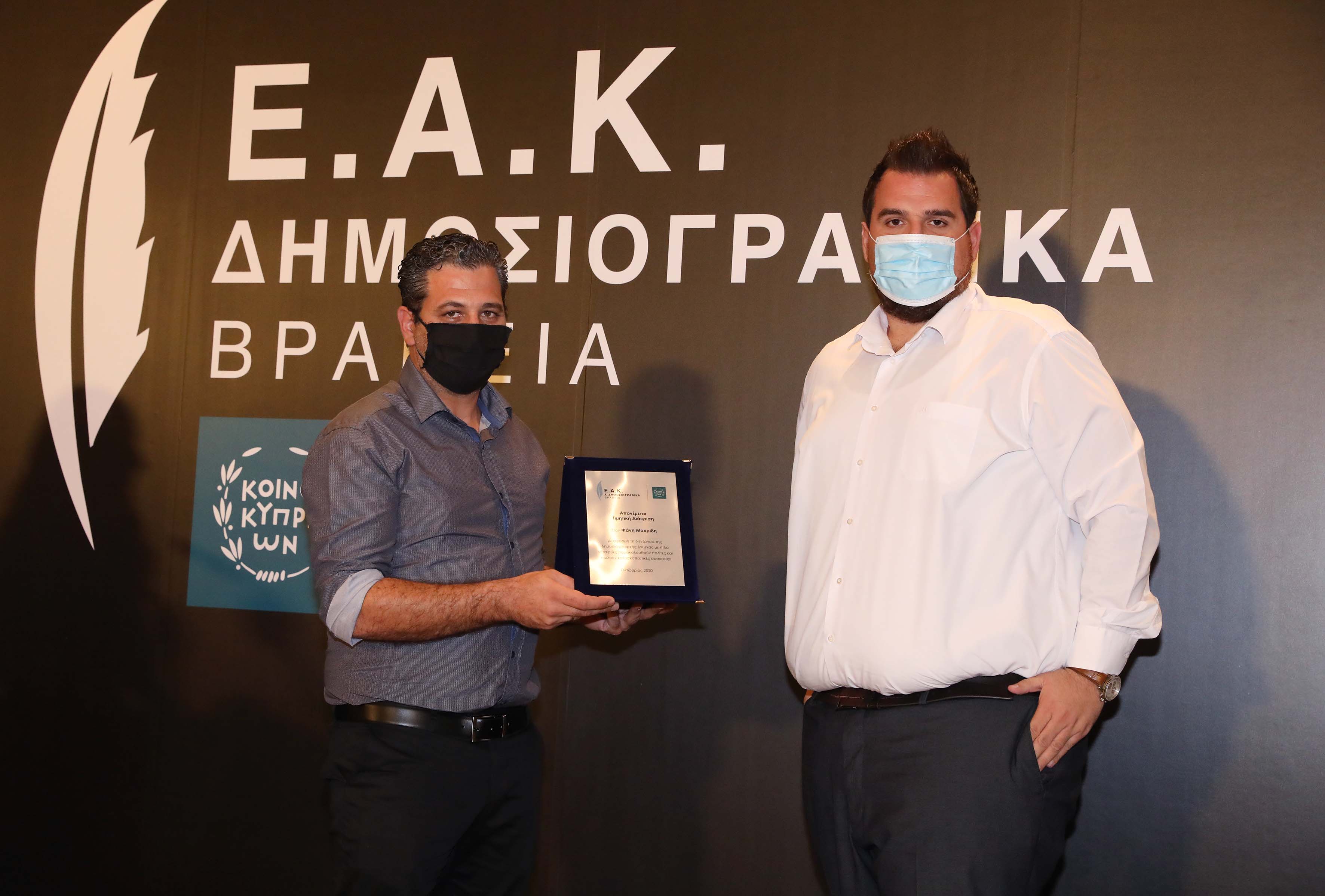 Στα πρώτα δημοσιογραφικά βραβεία της ΕΑΚ, απονεμήθηκε τιμητική διάκριση στον συνάδελφο, διευθυντή σύνταξης του ThemaOnline και της World News Media, Φάνη Μακρίδη, για το ρεπορτάζ του «Εταιρείες παρακολουθούν πολίτες και πωλούν κατασκοπευτικές συσκευές».