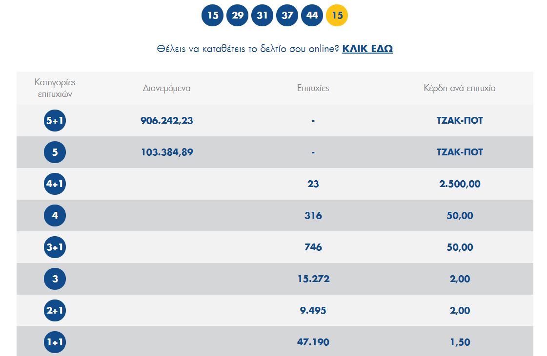 Οι αριθμοί που κληρώθηκαν είναι οι 15, 29, 31, 37, 44 και τζόκερ ο αριθμός 15.