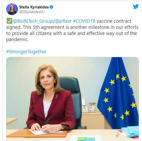 «Αυτή η 5η συμφωνία είναι άλλο ένα ορόσημο στις προσπάθειές μας να παράσχουμε σε όλους τους πολίτες έναν ασφαλή και αποτελεσματικό τρόπο για να αντιμετωπιστεί η πανδημία», έγραψε η Στέλλα Κυριακίδου.