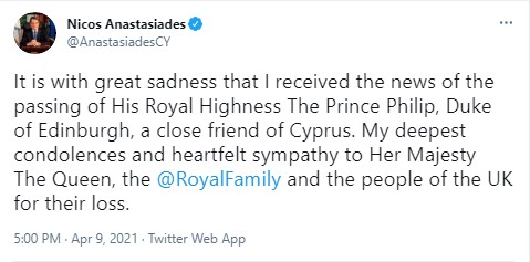 «Με μεγάλη θλίψη έλαβα την είδηση για το θάνατο του Πρίγκιπα Φιλίππου, Δούκα του Εδιμβούργου, στενού φίλου της Κύπρου. Τα βαθύτατα συλλυπητήριά μου και η ειλικρινή συμπάθειά μου στην Αυτού Μεγαλειότητα Η Βασίλισσα, η @Βασιλική οικογένεια και οι άνθρωποι του Ηνωμένου Βασιλείου για την απώλεια τους»
