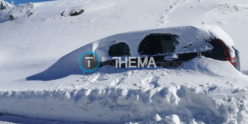 Στις φωτογραφίες μπορείτε να διακρίνετε ένα αυτοκίνητο το οποίο έχει ακινητοποιηθεί, αφού έχει σκεπαστεί από το χιόνι.