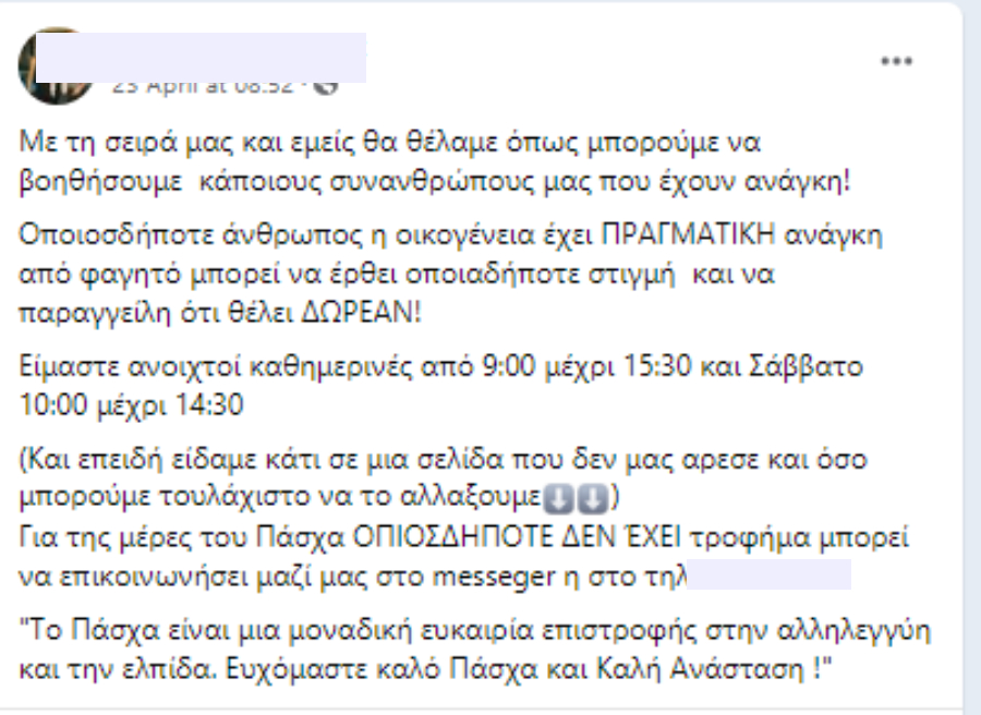 Συγκεκριμένα φαστφουντάδικο λίγες μέρες πριν ανακοίνωσε μέσω social media, ότι θα προσφέρουν δωρεάν φαγητό, την περιόδο του Πάσχα, σε οποιoδήποτε άνθρωπο ή οικογένεια έχει πραγματική ανάγκη απο φαγητό.