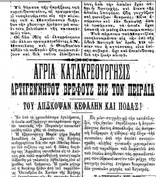 «Η κακούργος γραία Μαρία ανακρινόμενη κατατέθηκεν ότι όταν είδε ότι εγέννησε η θυγάτηρ της Αφροδίτη, σάστισε διότι απ’ έξω είχαν μαζευτεί γυναίκες και εφοβήθη μήπως αντιληφθούν αυτό το πράγμα με τα κλάματα του παιδιού και δια τούτο του έκοψε το κεφάλι με το μαχαίρι, πιστεύει ότι όμως ότι το παιδί γεννήθηκε νεκρό», γράφει η εφημερίδα «Σκριπ»….