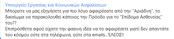 Η καταγγελία αφορά το γεγονός πως αφαιρέθηκε από την Αριάδνη το δικαίωμα να παρακολουθεί κάποιος την Πρόοδο για το "Επίδομα Ασθενείας" του. Αγανακτισμένος ο πολίτης καταγγέλει επίσης, το ότι οι αρμόδιοι παρ' όλη αυτή την αλλαγή, δεν απαντούν ούτε στα τηλέφωνα για βοήθεια και για απορίες του κοινού.