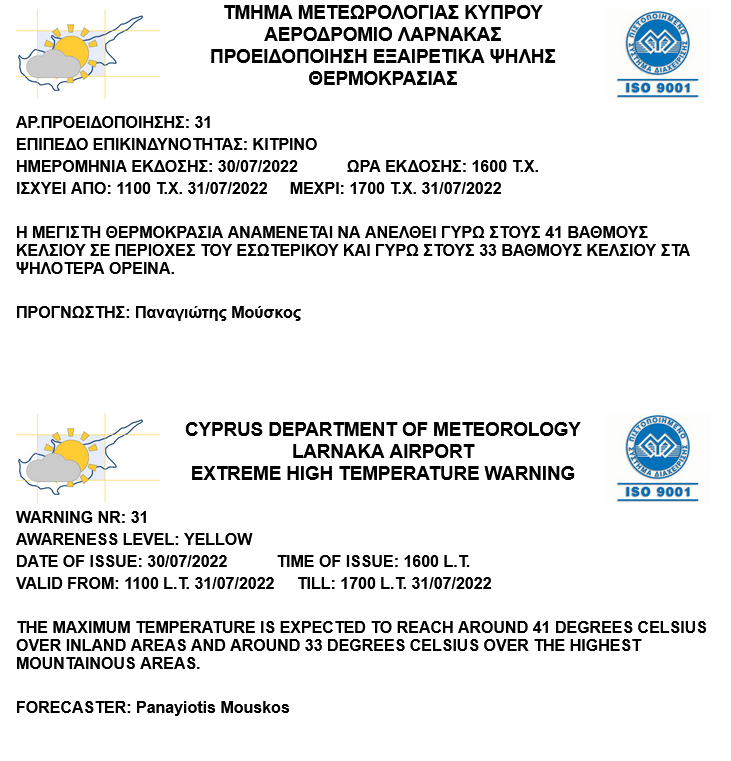 Η νέα προειδοποίηση τίθεται σε ισχύ από την Κυριακή στις 11:00 το πρωί μέχρις τις 17:00 το απόγευμα την ίδιας μέρας και η μέγιστη θερμοκρασία αναμένεται να ανέλθει γύρω στους 41 βαθμούς Κελσίου στο εσωτερικό και γύρω στους 33 βαθμούς στα ψηλότερα ορεινά.
