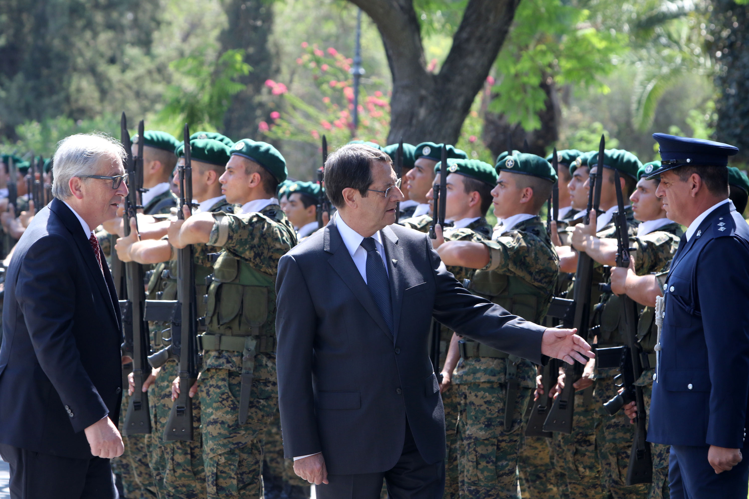 Τον κ. Γιούνκερ στο Προεδρικό Μέγαρο υποδέχθηκε ο Πρόεδρος Αναστασιάδης και αμέσως μετά η Φιλαρμονική της Αστυνομίας και άγημα της Εθνικής Φρουράς απέδωσαν τιμές.