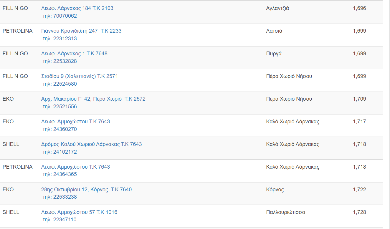 Πιο κάτω, οι τιμές που ισχύουν σήμερα σε πρατήρια ανά το παγκύπριο, καθώς και πίνακες με τα πρατήρια που πωλούν φθηνότερα τη βενζίνη 95 οκτανίων, τη βενζίνη 98 οκτανίων και το πετρέλαιο κίνησης.
