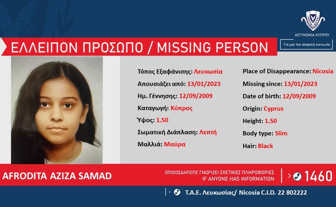 Η Αστυνομία ζητά πληροφορίες που μπορούν να βοηθήσουν στον εντοπισμό της Afrodita Aziza Samad, 13 ετών, η οποία ελλείπει από το χώρο διαμονής της, στη Λευκωσία, από τις 13 Ιανουαρίου 2023.