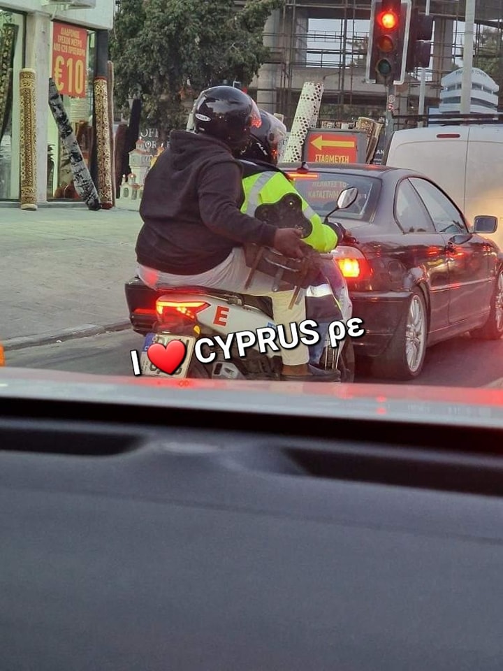 Συγκεκριμένα, όπως απεικονίζεται σε φωτογραφία που δημοσιεύτηκε στην ομάδα «I Love Cyprus ρε» στο Facebook, οδηγός μοτοσικλέτας βρίσκεται σταματημένος στα φώτα τροχαίας ενώ, ο συνοδηγός κρατάει στα χέρια μια φουκού.