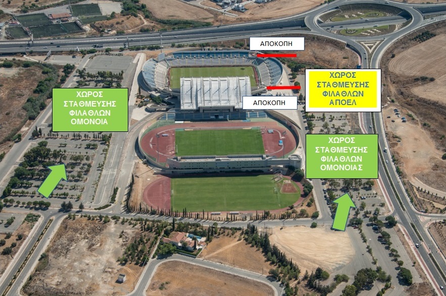 Οι φίλαθλοι του ΑΠΟΕΛ θα καταλάβουν τις Νότιες κερκίδες του Σταδίου και ως εκ τούτου, προτρέπονται να κατευθυνθούν στο Στάδιο μέσω του κυκλικού κόμβου του αυτοκινητοδρόμου παρά το Γ.Σ.Π. και της Λεωφόρου Ανεξαρτησίας. Να σταθμεύσουν τα οχήματα τους στον Νότιο χώρο στάθμευσης οχημάτων.