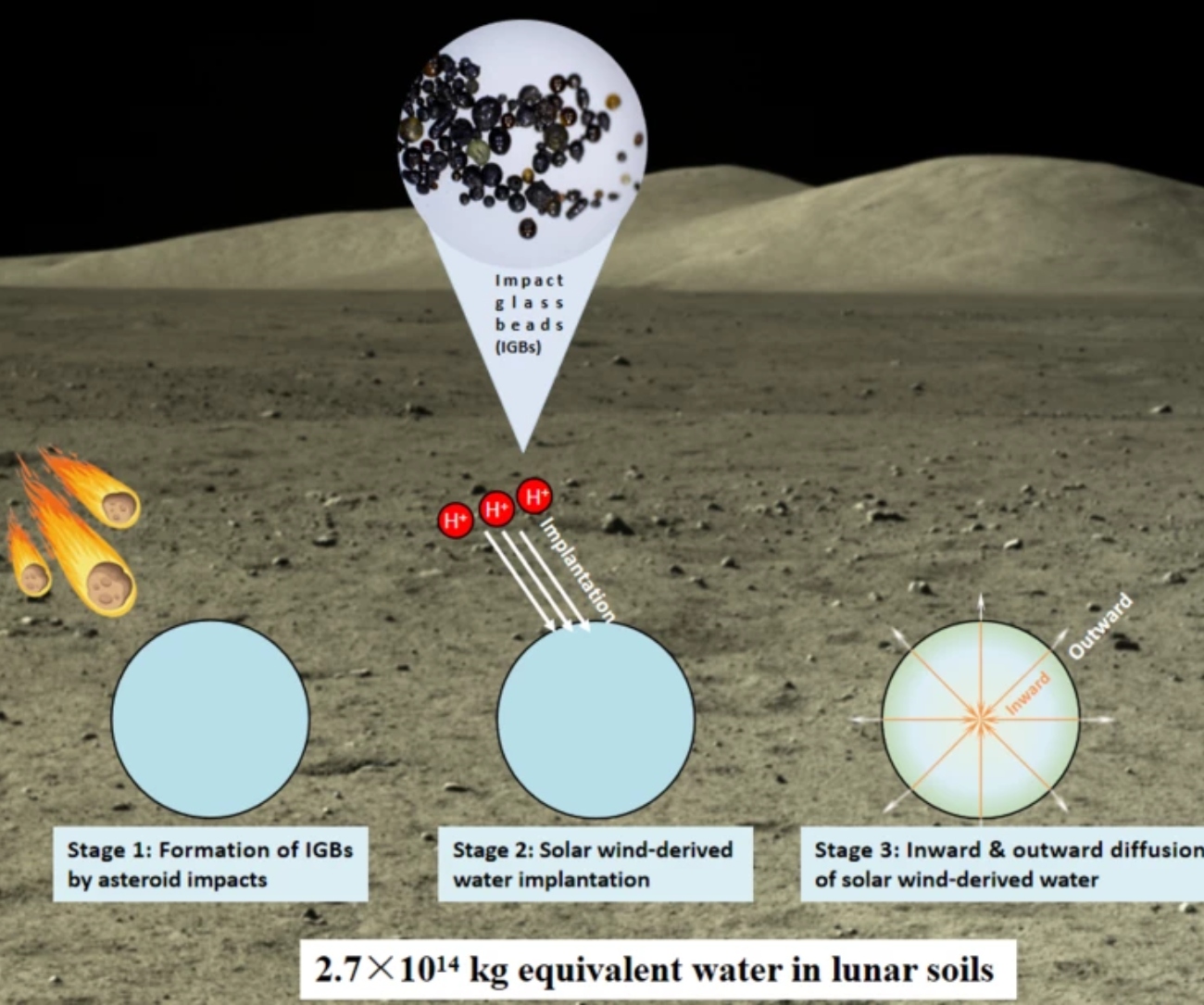 Μάλιστα, οι μελέτες δείχνουν ότι αυτά τα γυάλινα σφαιρίδια είναι πιθανότατα μια νέα δεξαμενή νερού στη Σελήνη. Τα γυάλινα σφαιρίδια έχουν ομοιογενείς χημικές συνθέσεις και λείες εκτεθειμένες επιφάνειες. Χαρακτηρίζονται από αφθονία νερού με εξαιρετικά χαρακτηριστικά έλλειψης δευτερίου. Η αρνητική συσχέτιση ανάμεσα στην αφθονία νερού και στη σύνθεσή του αντανακλά το γεγονός ότι το νερό στα σφαιρίδια προέρχεται από ηλιακούς ανέμους.