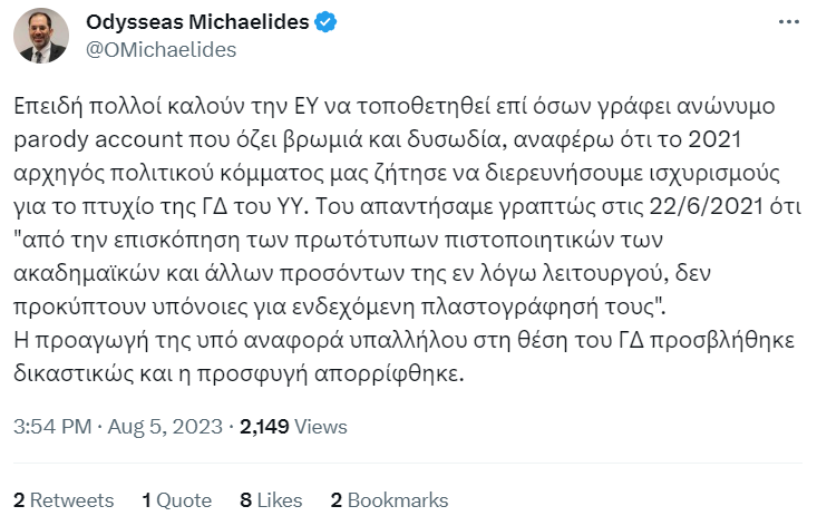 Όπως σημειώνει στην ανάρτησή του στο Twitter ο Γενικός Ελεγκτής: «Επειδή πολλοί καλούν την ΕΥ να τοποθετηθεί επί όσων γράφει ανώνυμο parody account που όζει βρωμιά και δυσωδία, αναφέρω ότι το 2021 αρχηγός πολιτικού κόμματος μας ζήτησε να διερευνήσουμε ισχυρισμούς για το πτυχίο της ΓΔ του ΥΥ. Του απαντήσαμε γραπτώς στις 22/6/2021 ότι "από την επισκόπηση των πρωτότυπων πιστοποιητικών των ακαδημαϊκών και άλλων προσόντων της εν λόγω λειτουργού, δεν προκύπτουν υπόνοιες για ενδεχόμενη πλαστογράφησή τους. Η προαγωγή της υπό αναφορά υπαλλήλου στη θέση του ΓΔ προσβλήθηκε δικαστικώς και η προσφυγή απορρίφθηκε».