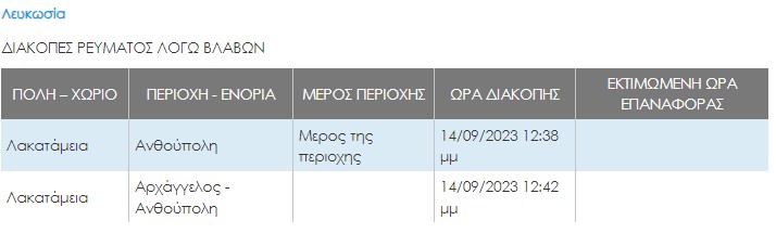 Επηρεάζονται κυρίως περιοχές της Ανθούπολης και Λακατάμιας. Σύμφωνα με ενημέρωση από την ΑΗΚ, συνεργείο της Αρχής έχει μεταβεί στην περιοχή και αναζητά το σημείο της βλάβης για αυτό και δεν έχει τεθεί ακόμη χρόνος επαναφοράς του ρεύματος.