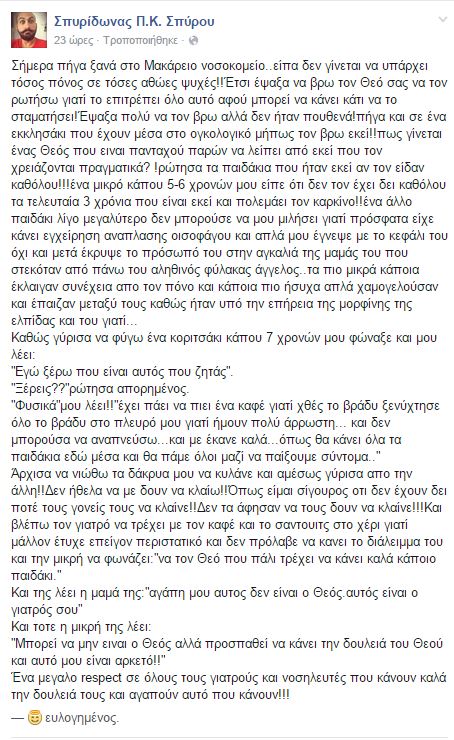 «Σήμερα πήγα ξανά στο Μακάρειο νοσοκομείο..είπα δεν γίνεται να υπάρχει τόσος πόνος σε τόσες αθώες ψυχές!!Έτσι έψαξα να βρω τον Θεό σας να τον ρωτήσω γιατί το επιτρέπει όλο αυτό αφού μπορεί να κάνει κάτι να το σταματήσει! Έψαξα πολύ να τον βρω αλλά δεν ήταν πουθενά! πήγα και σε ένα εκκλησάκι που έχουν μέσα στο ογκολογικό μήπως τον βρω εκεί!!πως γίνεται ένας Θεός που είναι πανταχού παρών να λείπει από εκεί που τον χρειάζονται πραγματικά? !ρώτησα τα παιδάκια που ήταν εκεί αν τον είδαν καθόλου!!!ένα μικρό κάπου 5-6 χρονών μου είπε ότι δεν τον έχει δει καθόλου τα τελευταία 3 χρόνια που είναι εκεί και πολεμάει τον καρκίνο!!ένα άλλο παιδάκι λίγο μεγαλύτερο δεν μπορούσε να μου μιλήσει γιατί πρόσφατα είχε κάνει εγχείρηση ανάπλασης οισοφάγου και απλά μου έγνεψε με το κεφάλι του όχι και μετά έκρυψε το πρόσωπό του στην αγκαλιά της μαμάς του που στεκόταν από πάνω του αληθινός φύλακας άγγελος..τα πιο μικρά κάποια έκλαιγαν συνέχεια από τον πόνο και κάποια πιο ήσυχα απλά χαμογελούσαν και έπαιζαν μεταξύ τους καθώς ήταν υπό την επήρεια της μορφίνης της ελπίδας και του γιατί...