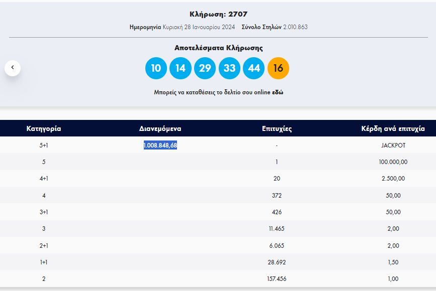 Οι τυχεροί αριθμοί στην κλήρωση Τζόκερ σήμερα είναι οι αριθμοί 10, 14, 29, 33, 44 και τζόκερ ο αριθμός 16.