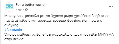 Σε άλλη περίπτωση μητέρα 3χρονου παιδιού χρειάζεται πάνες και τρόφιμα, ενώ σε μια τρίτη περίπτωση μια γυναίκα η οποία στεγάζεται σε ίδρυμα χρειάζεται τα απαραίτητα φροντίδας.