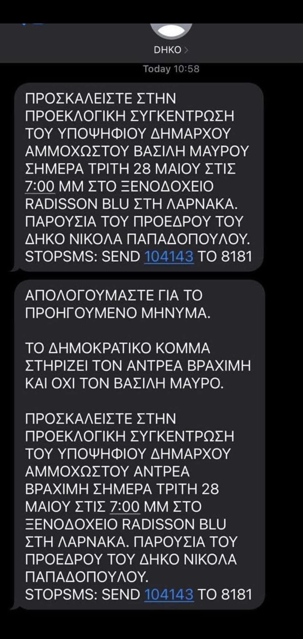 Το ΔΗΚΟ έστειλε sms καλώντας τους ψηφοφόρους του κόμματος να παραστούν σε συνέλευση υποψηφίου για τον Δήμο Αμμοχώστου, που δεν στηρίζουν. Στη συνέχεια ανακάλεσαν με νέο sms.
