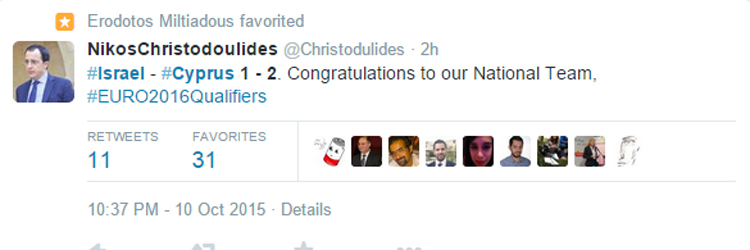 Την επιτυχία της Κύπρου χάρηκε ιδιαίτερα και ο Νίκος Χριστοδουλίδης. Ο κυβερνητικός εκπρόσωπος σημείωσε στον λογαριασμό του στο facebook: «Συγχαρητήρια στην Εθνική μας ομάδα».