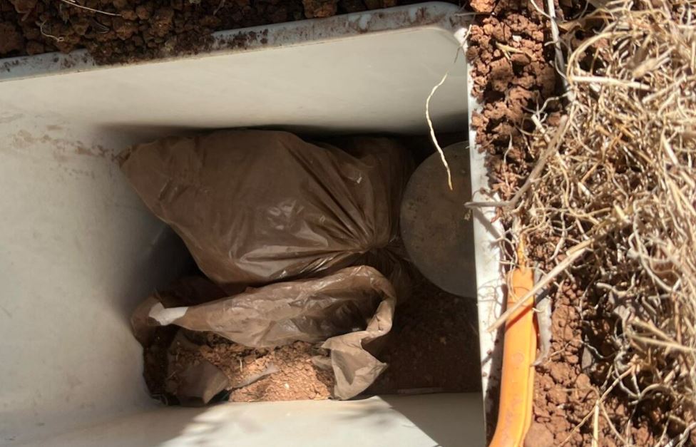 Στη συνέχεια, σε έρευνα που έγινε σε παρακείμενο ανοικτό χώρο, όπου προηγουμένως είχε θεαθεί ο ύποπτος να σκάβει και να τοποθετεί ένα αντικείμενο, εντοπίστηκε στο χώμα, θαμμένη μία παγωνιέρα, η οποία περιείχε νάιλον συσκευασίες με κοκαΐνη 30 γραμμαρίων περίπου και 225 γραμμαρίων κάνναβης. Παράλληλα, εντοπίστηκε ποσότητα συμπαγούς ουσίας έκσταση βάρους 30 γραμμαρίων περίπου.