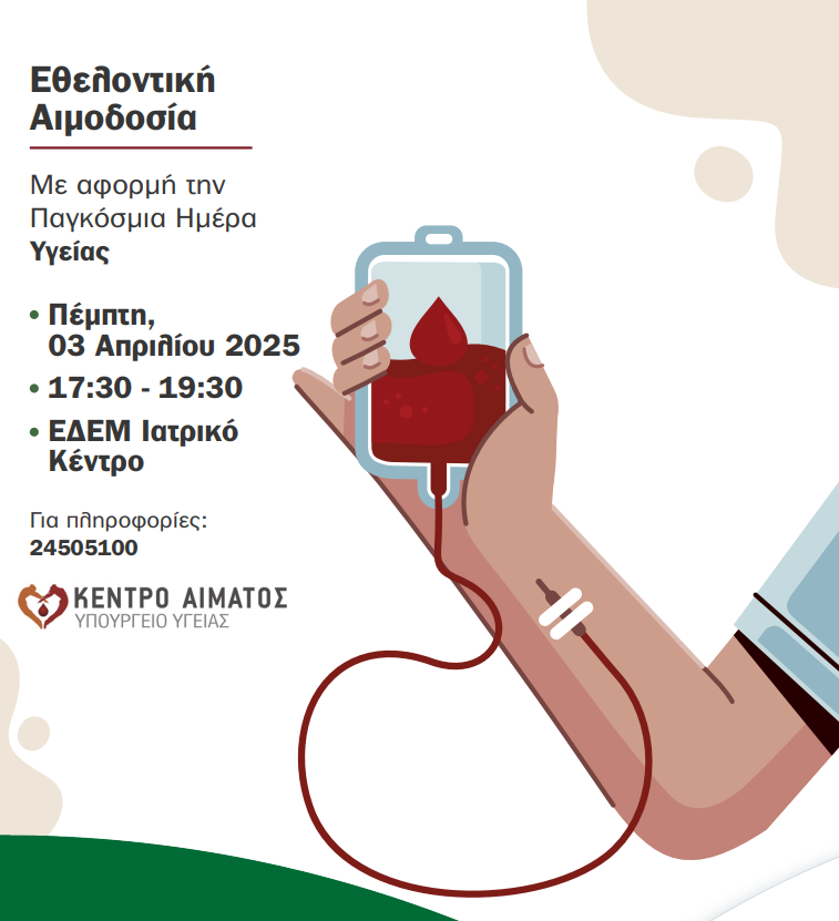 Εθελοντική αιμοδοσία με αφορμή την παγκόσμια Ημέρα Υγείας, διεξάγεται την Πέμπτη 3 Απριλίου 2025, στο ΕΔΕΜ Ιατρικό Κέντρο.