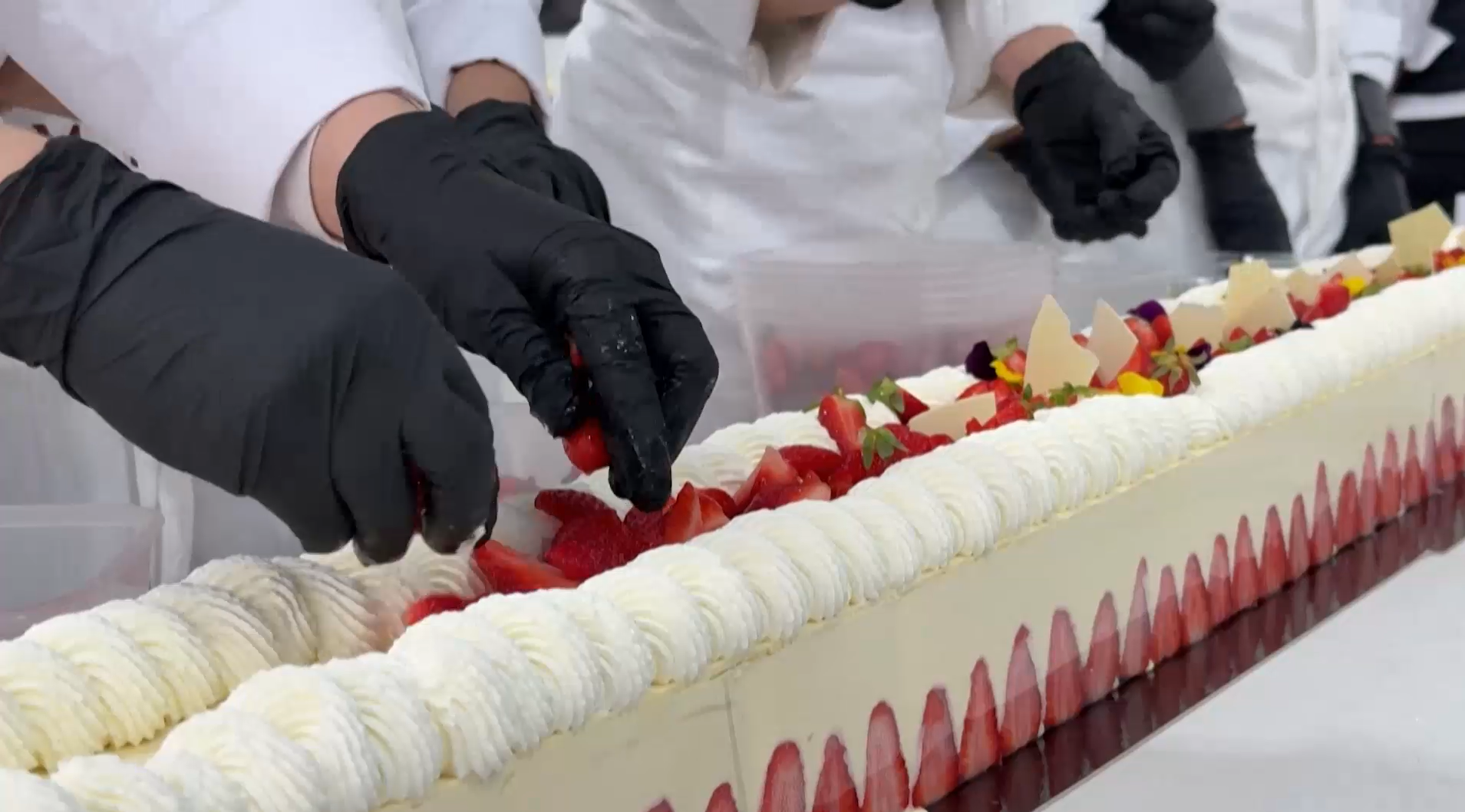 Περίπου 350 κιλά φράουλες, 150 κιλά ζάχαρη, 415 κιλά κρέμα πατισερί και 4.000 αυγά: ένα ζαχαροπλαστείο στο Argenteuil (Val-d’Oise) κατέρριψε το ρεκόρ για τη μεγαλύτερη τούρτα φράουλας στον κόσμο, με μια τούρτα πιστοποιημένου μήκους 121,88 μέτρων.