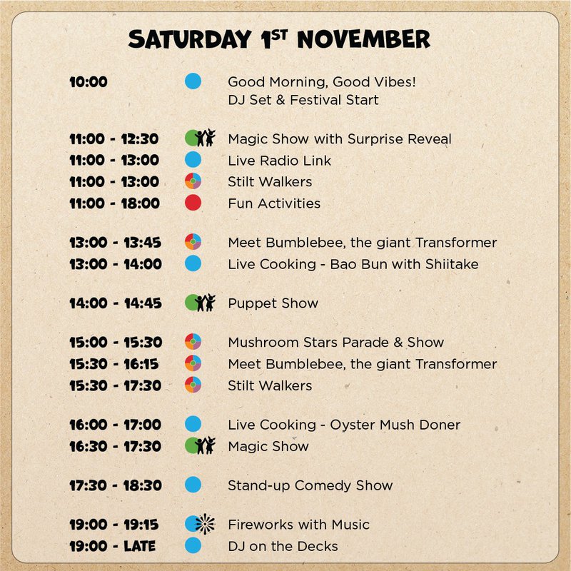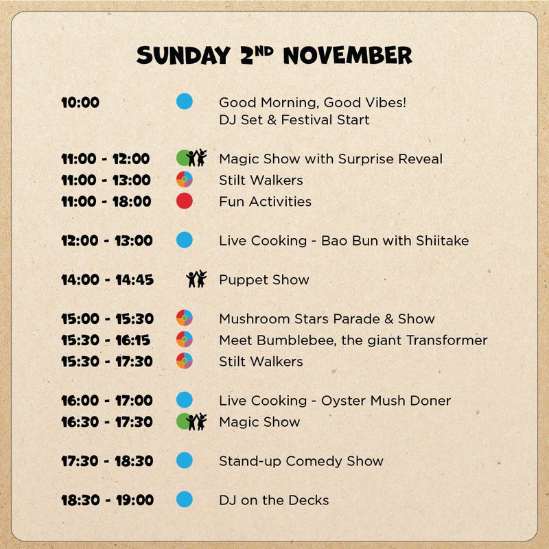 Με ώρες λειτουργίας από το πρωί μέχρι αργά το βράδυ το Σάββατο (10:00–22:00) και μέχρι το απόγευμα την Κυριακή (10:00–19:00), το Cyprus Mushroom Festival φιλοδοξεί να εξελιχθεί σε μια μεγάλη γιορτή της κυπριακής υπαίθρου. Το πλήρες πρόγραμμα με τα αναλυτικά δρώμενα αναμένεται να ανακοινωθεί τις επόμενες ημέρες στην επίσημη σελίδα του φεστιβάλ, ωστόσο ήδη το ενδιαφέρον είναι έντονο.