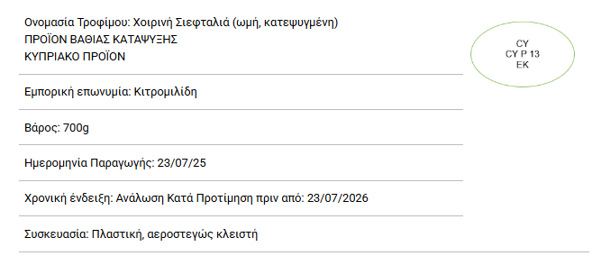 Το Υπουργείο Υγείας πληροφορεί το καταναλωτικό κοινό ότι οι Υγειονομικές Υπηρεσίες του Υπουργείου, στο πλαίσιο των επίσημων ελέγχων που διεξάγουν στην αγορά, έχουν προβεί σε δειγματοληψία του πιο κάτω προϊόντος, στο οποίο μετά από εργαστηριακές εξετάσεις στα διαπιστευμένα εργαστήρια του Γενικού Χημείου του Κράτους ανιχνεύθηκε το μικρόβιο Salmonella spp.