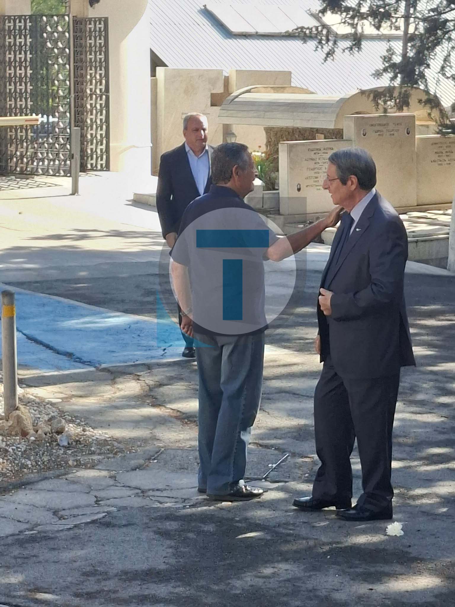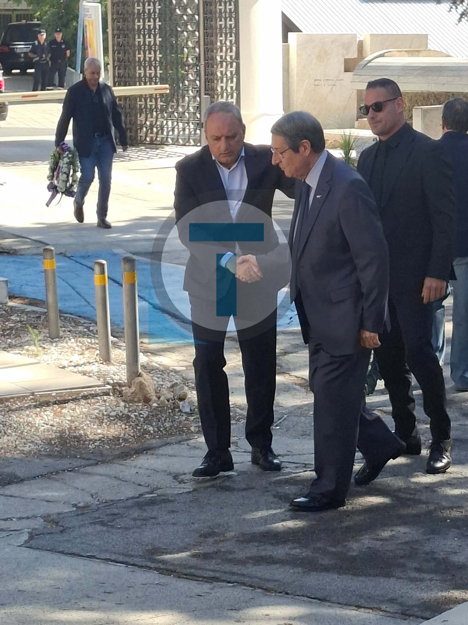 Η κάμερα του ThemaOnline, απαθανάτισε τους δύο άντρες στην είσοδο του Ιερού Ναού Κωνσταντίνου και Ελένης όπου τελείται η κηδεία να αγκαλιάζονται και να ανταλλάζουν χειραψίες.