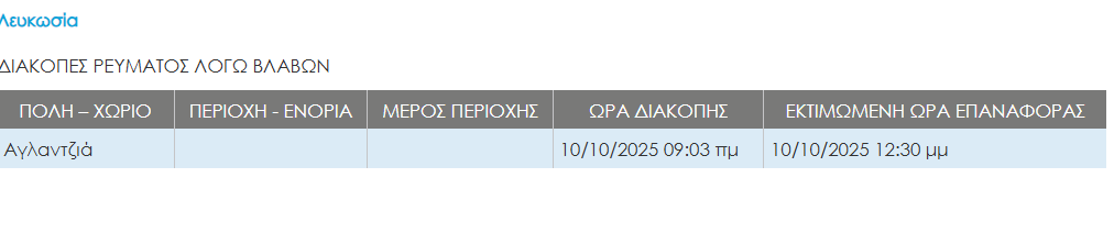 Συγκεκριμένα, σύμφωνα με την εκπρόσωπο τύπου της ΑΗΚ, Χριστίνα Παπαδοπούλου παρατηρήθηκε βλάβη μέση τάσης στην Αγλαντζιά.
